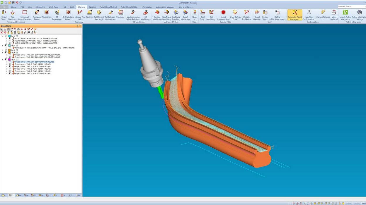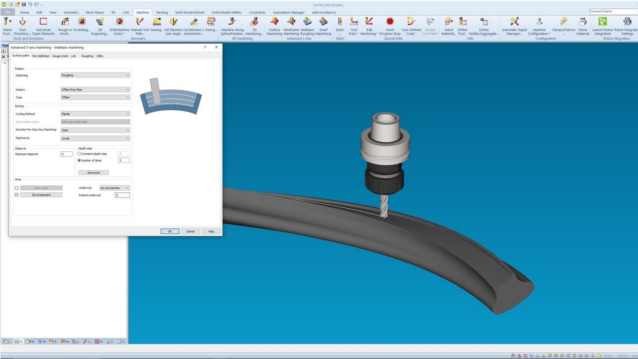 Agregáty s programovatelnou rotační osou a ručním naklápěním jsou plně podporovány, stejně jako plně interpolující 5osé hlavy. Bezpečné rychlé pohyby mezi rovinami jsou automaticky řízeny a ověřovány pomocí pokročilé simulace těles.