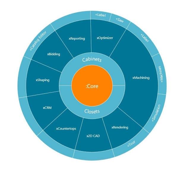 Modulární systém umožňující licenční nastavení systému CABINET VISION podle potřeb uživatele. Licence postavená na Core dovoluje rozšiřovat vlastnosti programu od holého návrhu až po generování a propojení výstupů s technologickým vybavením (nářezová centra, CNC stroje).