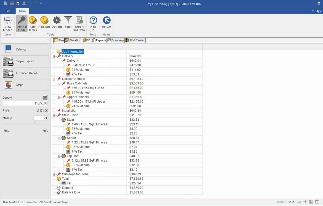 pokročilý report - nastavení úrovní zobrazení, od popisu skříněk přes použité materiály až po kalkulovanou cenu každé jednotlivé skříňky. Výstup může nabízet uživatelské dialogové rozhraní pro dopočet slevy zakázky, DPH nebo jiných atributů,