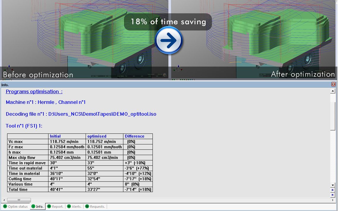Díky nástroji NCSIMUL Optitool může uživatel definovat vlastní parametry nájezdu a přísunu, aby se minimalizovalo obrábění vzduchu a maximalizovalo využití rychloposuvů (nebo vysokorychlostního pracovního posuvu).