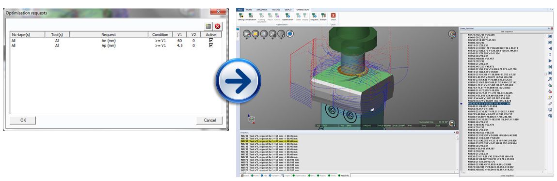 NCSIMUL Optitool je vybaven funkcí víceparametrového vyhledávání, která uživatelům umožňuje analyzovat jeden NC program,celou sadu NC programů, pro jeden nebo více nástrojů, podle jejich řezných parametrů. Aniž by NCSIMUL Optitool vyžadoval jakoukoli úpravu programu, je schopen najít úseky trajektorie nástroje (lze nastavit v závislosti na průměru nástroje), které neodpovídají řezným podmínkám definovaným uživatelem.