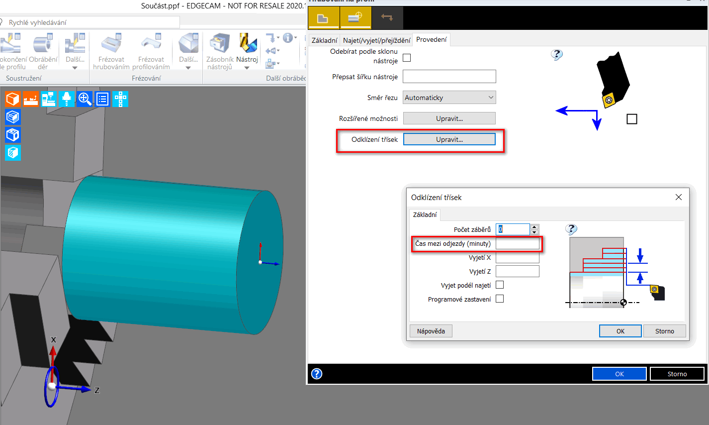 - vylepšení cyklu hrubování na profil o možnost odklízení třísek po stanoveném času a hloubce záběru (lze tak efektivně odklízet třísky a zabránit jejich kupení kolem držáku nože. Po uplynutí dané lhůty nástroj odjede do bezpečné vzdálenosti, kterou lze taktéž nastavit),