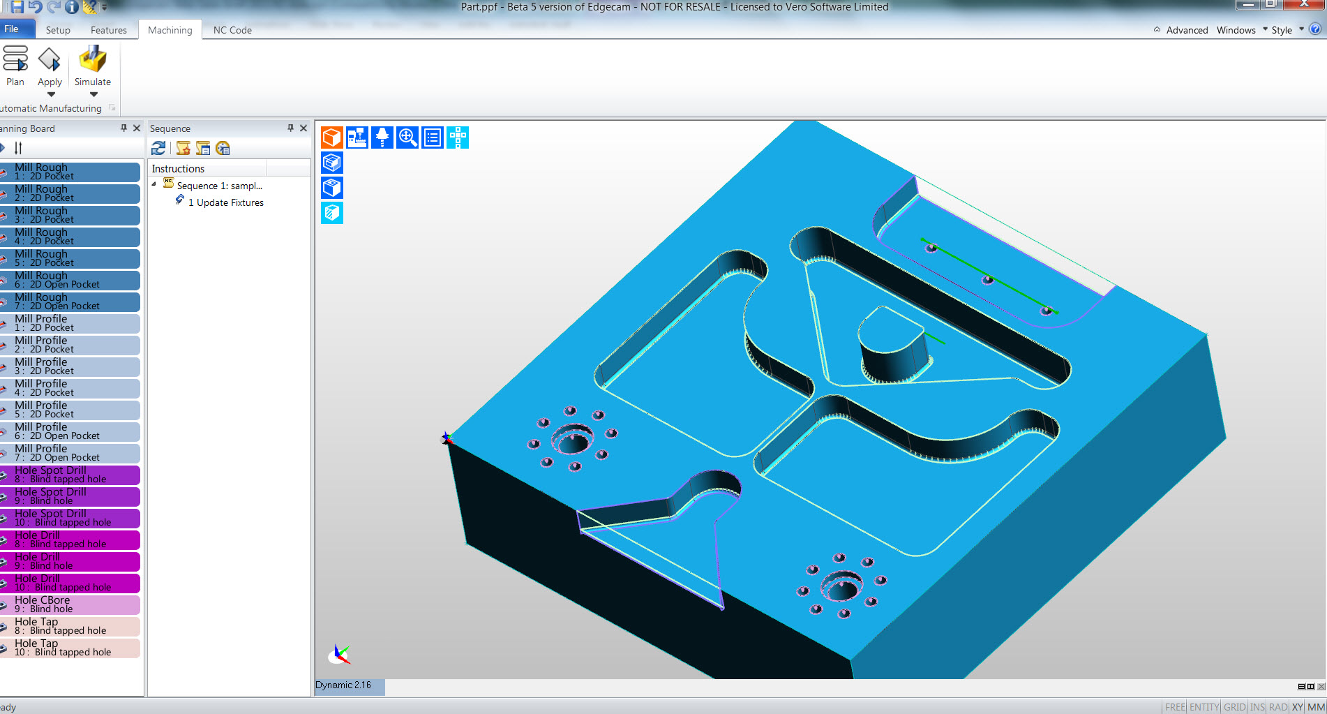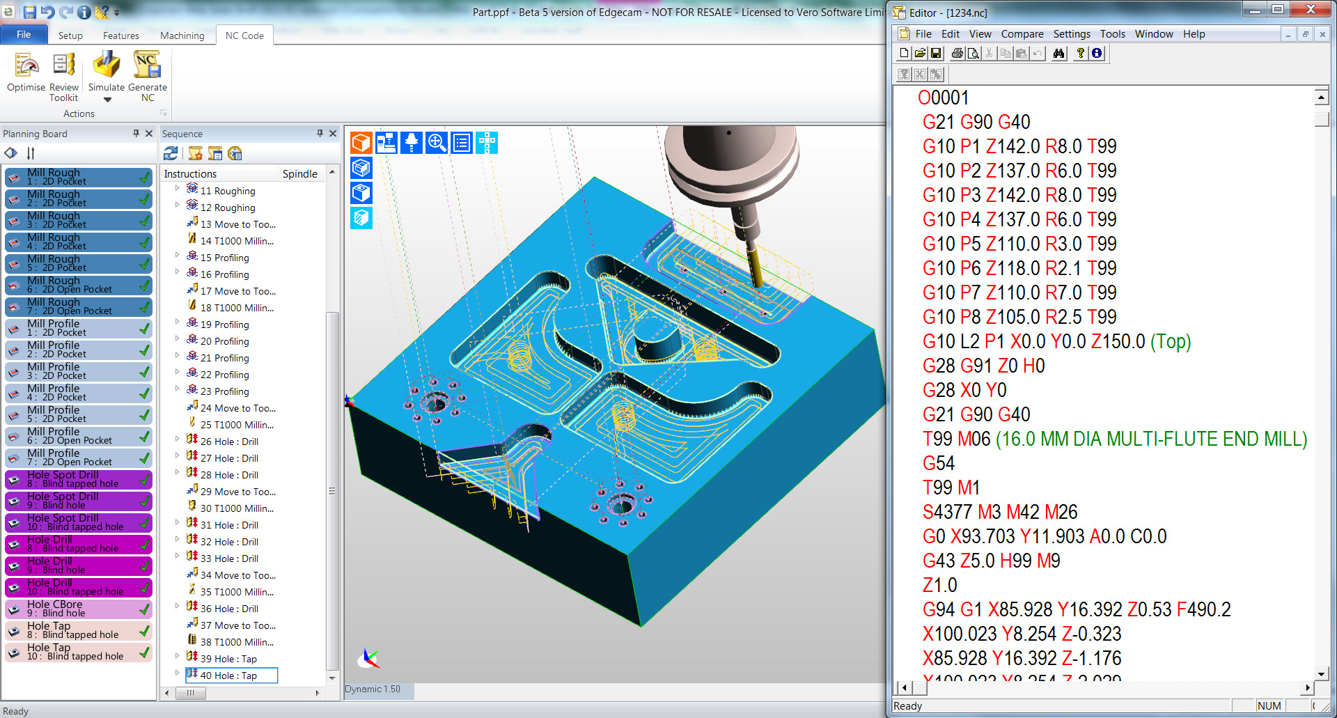 - NC kód: výsledné obrábění je v simulátoru zkontrolováno proti kolizím, podřezání nebo naopak zbytkům. V průběhu simulace jsou také kontrolovány limity os stroje. Lze zobrazit seznam použitých nástrojů a provádět potřebné úpravy, to vše ještě před generováním NC kódu, jakožto posledního z pěti kroků vedoucích k rychlejšímu programování.