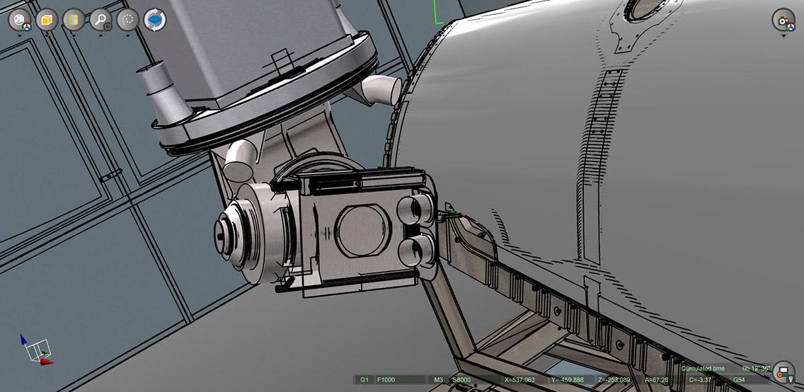 CTRM started new composite parts production on their newly implemented 5-axis gantry-type machines. Large machines, parts and complex processes often lead to manufacturing issues such as inaccurate hole positions, over trim at the end of edges, collisions because of unsuitable cutting tools and programs or insufficient tool-length. These issues can add to very high costs for online debugging, many setups and scrap parts. The NC programs and cycles using the machines' physical properties such as linear motors, automatic tool changer, automatic dust extractor attachment changer, multiple axes working simultaneously, automatic laser tool offset measurement, workpiece probing, special design drilling tools, and more needed to be fully verified and simulated before sending the final program to the actual machine.