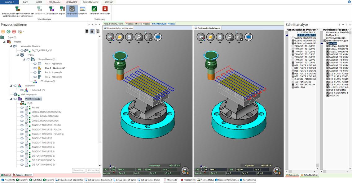 The machine simulation checks the NC code after the post processor operation, generating absolutely collision-free programs at maximum speed which also considers the set-up situation, as well as swivel and entry movements in the machining area. Furthermore, the tool paths will be optimized; unnecessary tool motions, as well as the dreaded tool crashes, will be avoided. According to the manufacturer, NCSIMUL users can reduce the processing time of their NC programs by 20% on average simply by optimizing processes.