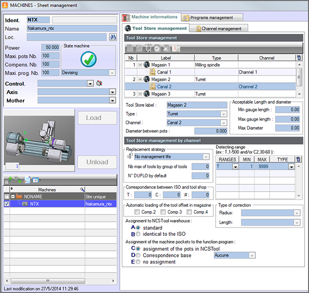 - Machine parameters are now declared by tool magazine and channel. The management of tool assignment and optimization strategies by magazine is accessible for multi-channel and/or multi-magazine machines.
