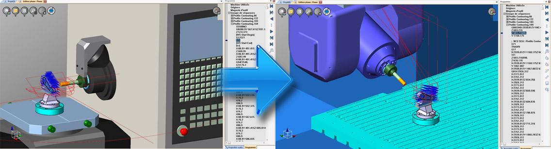 - Because the language used in CAM is not that of the NC machine, it is rare that users take advantage of changes that can be made to G-code programs on the machine itself (e.g. setting corrections). In fact, corrections have to be made as far as possible upstream if they are to be re-used in a conventional CAM process. With NCSIMUL 4CAM, a machining sequence is directly matched to CNC language instructions. If these are changed, the correction is reflected in the NCSIMUL 4CAM project.