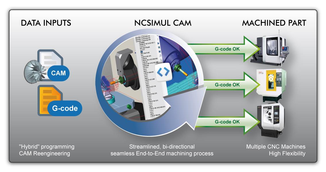 The innovation embodied in NCSIMUL 4CAM, a module of the NCSIMUL SOLUTIONS suite, has brought the finishing touch of flexibility to the CAM systems available on the market today. With NCSIMUL 4CAM, new NC machines can now be quickly integrated into the production cycle, and existing machines can be redeployed in the shop to optimize their uptime, while tool paths are reprogrammed in just a few clicks to speed up production rates across all types of NC machines.