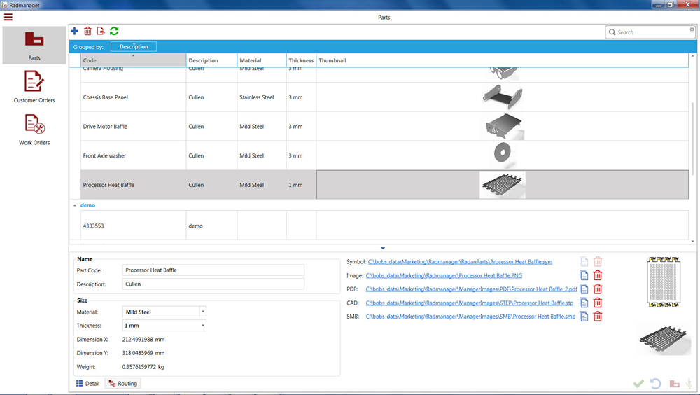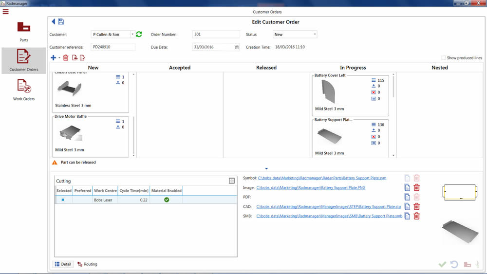 Firstly, information about the parts a company manufactures is stored, so repeat orders can be easily entered. Part data can be gathered from existing RADAN part files, or entered manually before the part is drawn. “Additional details, such as pictures, related CAD files and manufacturing data, can be attached to the part, so there’s no need to enter data repeatedly every time the component is manufactured.”