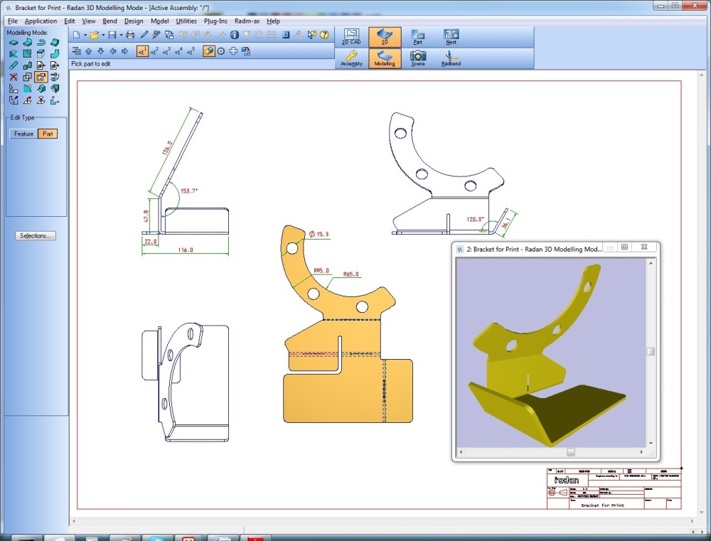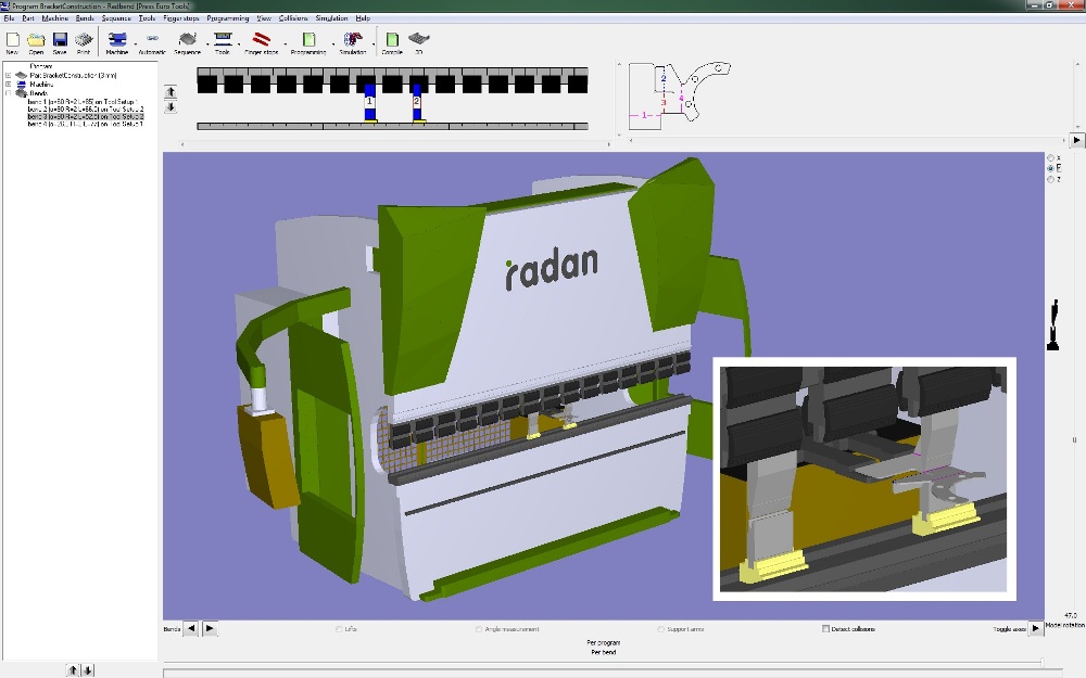 RADAN 3D and Radbend: The improved connection between RADAN 3D and Radbend allows parametric programming of parts. After a change to the 3D model in RADAN 3D, the Radbend program (tool selection and fingerstop positioning) is automatically updated.