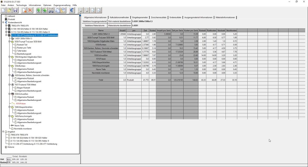 “Predefined formulae are then inputted using popup menus for the costs of individual operations on the parts – including bending, straighten, deburring, welding, glass-bead-blasting, drilling, purchased parts, manpower and delivery.