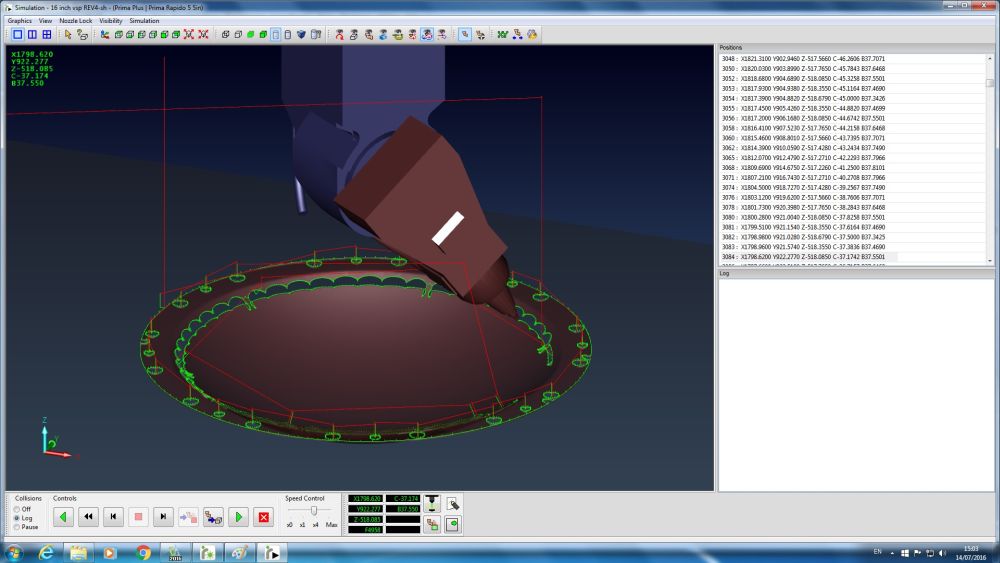 The toolpaths are accurately simulated on screen, showing the angle of the nozzle as it moves around the part, providing instant feedback on whether or not a specific move is possible. If any collisions are detected they are highlighted both on the model and via on-screen messages.